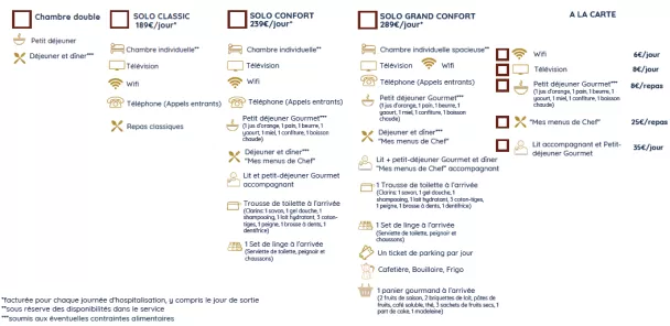 Il se peut que le rythme des sorties et urgences ne permette pas, à votre arrivée, de satisfaire votre demande. L'établissement fera alors le maximum pour répondre à votre attente dès que possible. Ces prestations peuvent être prises en charge par votre mutuelle selon la nature de votre couverture.